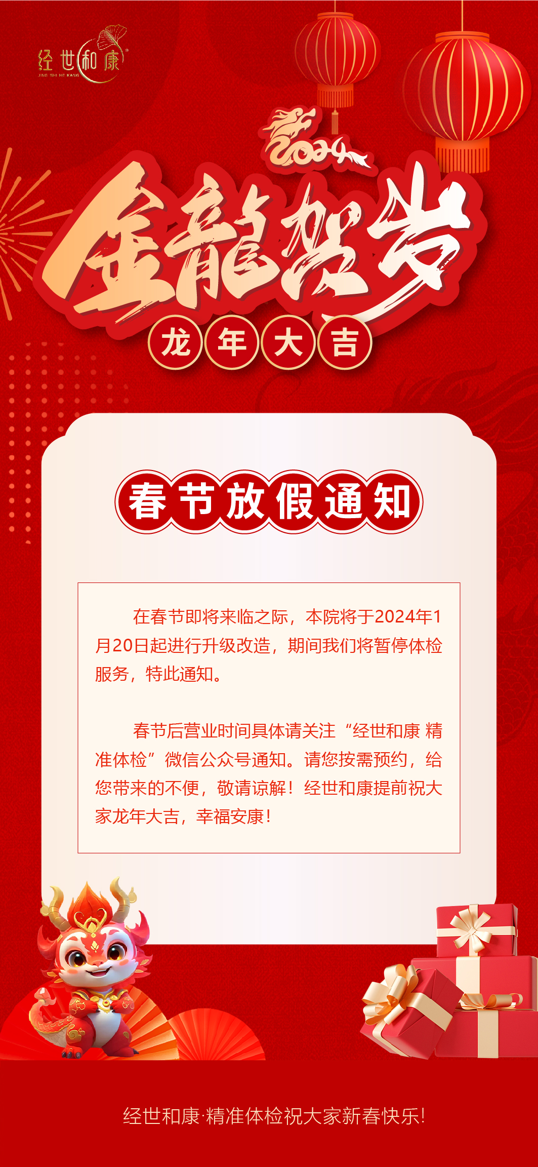 春節(jié)后營業(yè)時間具體請關(guān)注“經(jīng)世和康 精準(zhǔn)體檢”微信公眾號通知。請您按需預(yù)約,給您帶來的不便,敬請諒解!經(jīng)世和康提前祝大家龍年大吉,幸福安康!